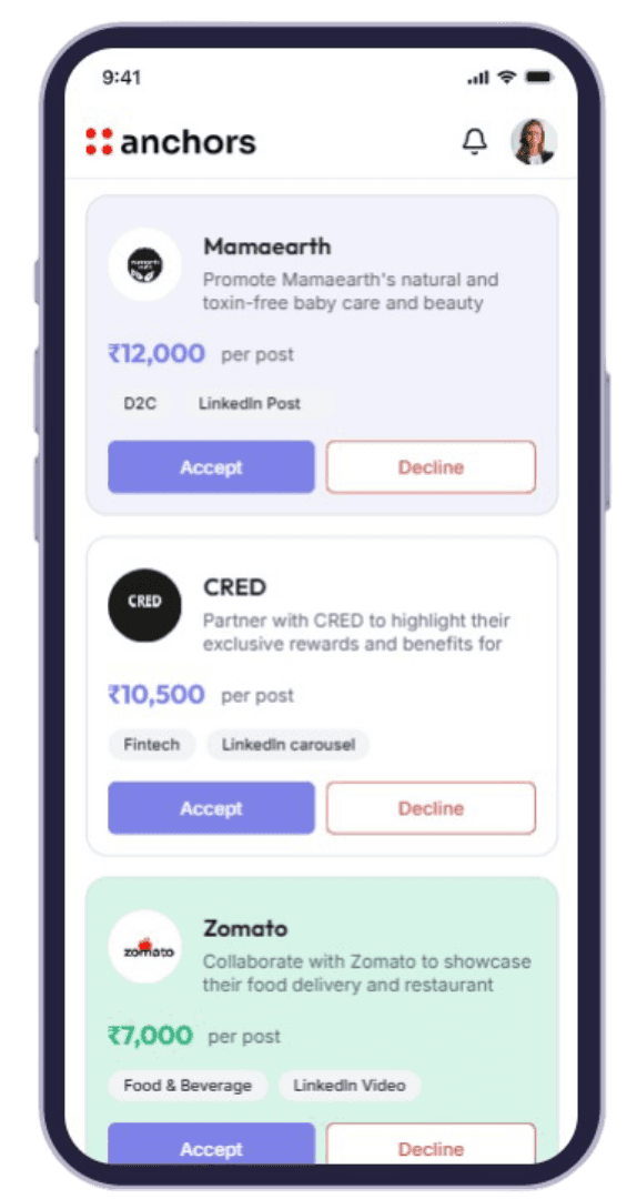 Yes. We’ve partnered with a diverse mix of brands, from startups to large enterprises, including Cars24, Masai, Fretbox, and more, across industries like SaaS, EdTech, D2C, and AI tools. This means you could get matched with opportunities from all kinds of companies, based on your profile and audience fit.